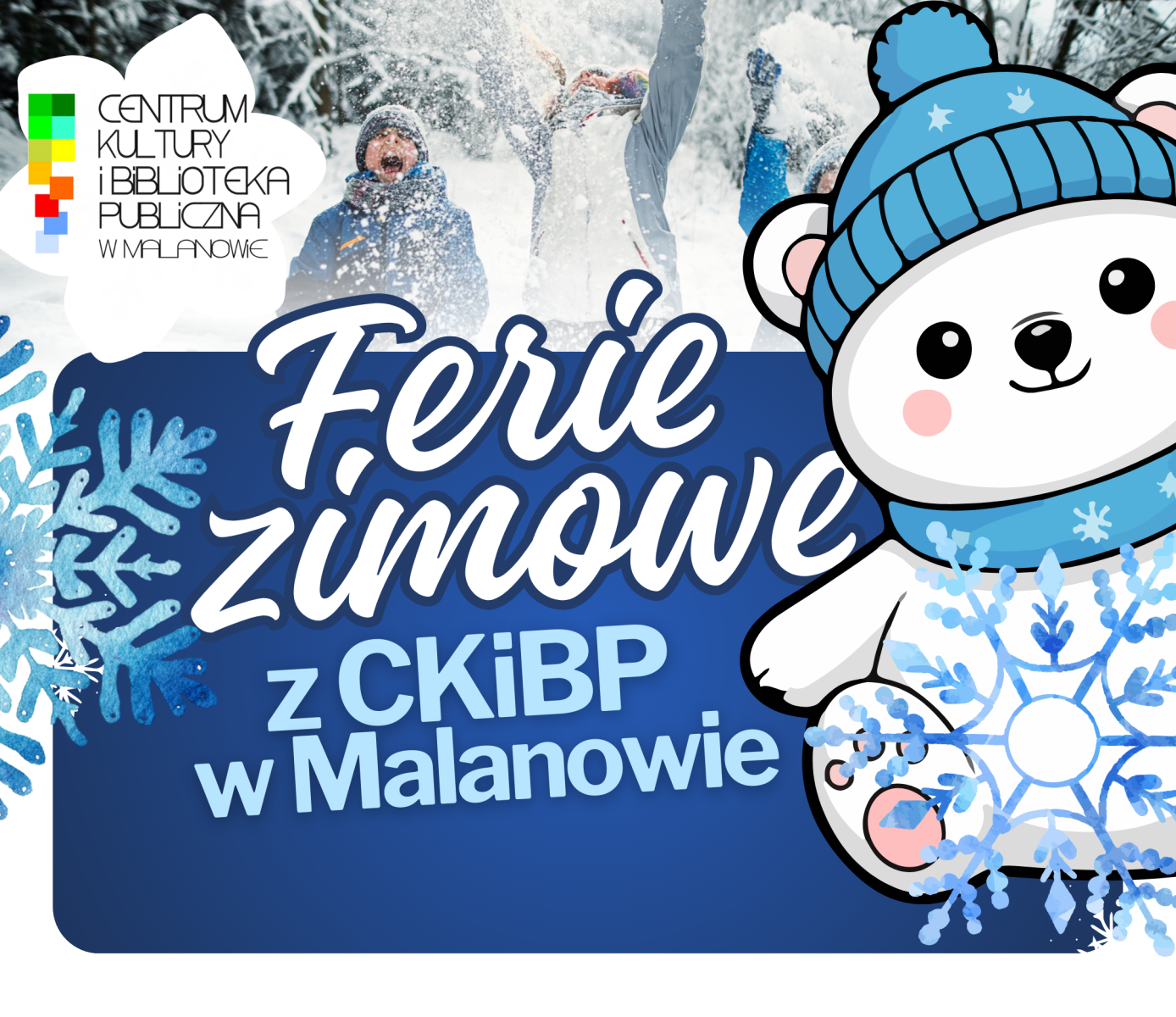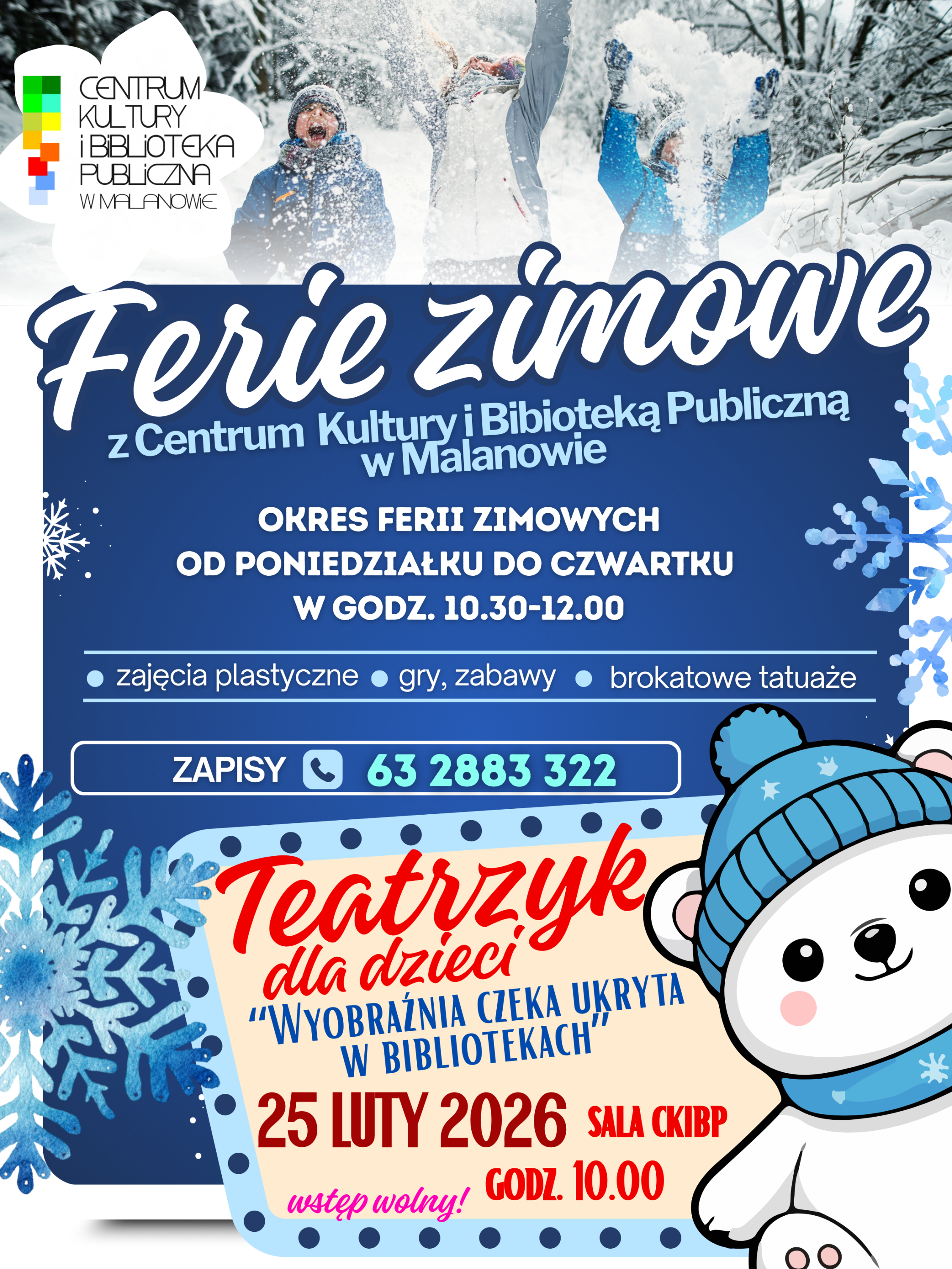 Centrum Kultury i Biblioteka Publiczna w Malanowie zaprasza wszystkie dzieci w wieku 6–10 lat na wesołe zajęcia podczas ferii zimowych.