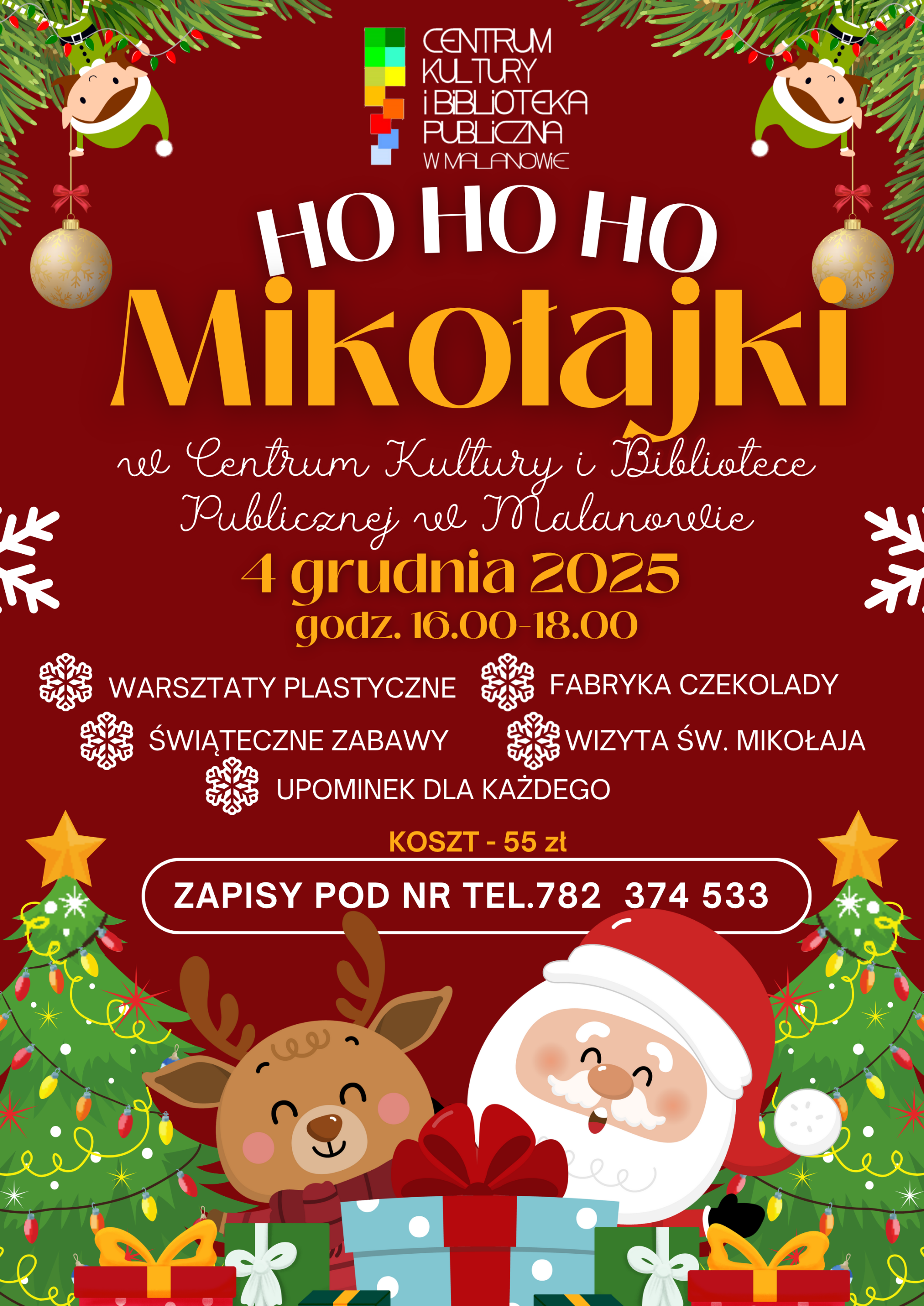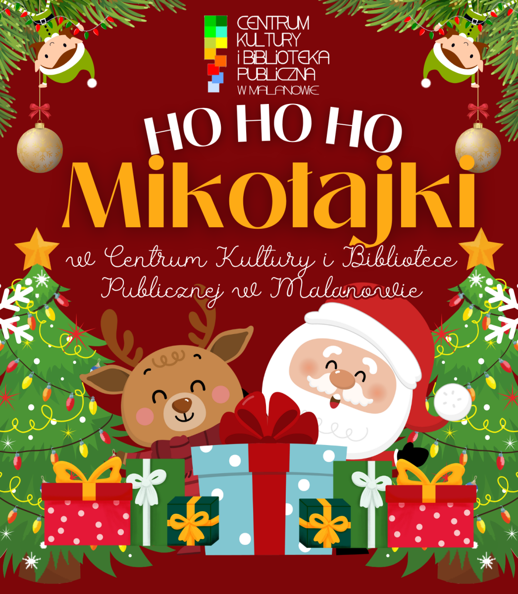 W oczekiwaniu na zbliżające się wielkimi krokami Mikołajki Centrum Kultury i Biblioteka Publiczna w Malanowie pragnie zaprosić najmłodszych do udziału w mikołajkowym spotkaniu, które odbędzie się 4 grudnia w godz. 16.00-18.00. Tego dnia nie zabraknie dziecięcej radości i dobrej zabawy, a wszystko to w iście mikołajkowej atmosferze.