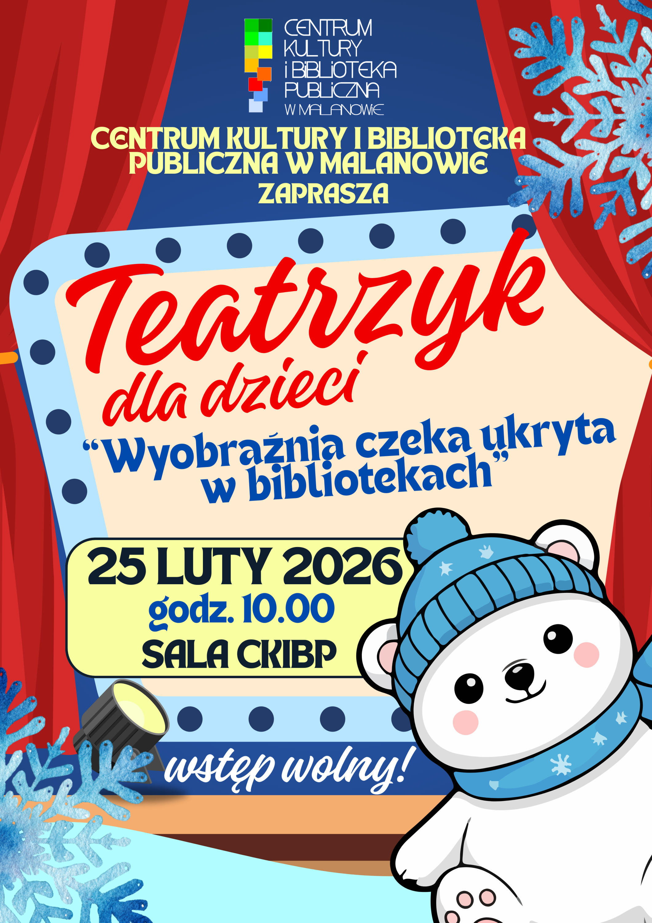 Serdecznie zapraszamy wszystkie dzieci na pełen radości i przygód teatrzyk pt. „Wyobraźnia czeka ukryta w bibliotekach”. Spotykamy się 25 lutego 2026 r. o godz. 10.00 w sali CKiBP. To doskonała okazja, by przenieść się do świata bajek i rozbudzić wyobraźnię. Wstęp wolny – czekamy na Was!