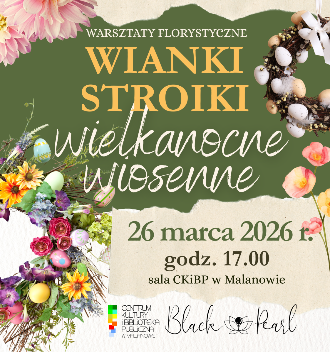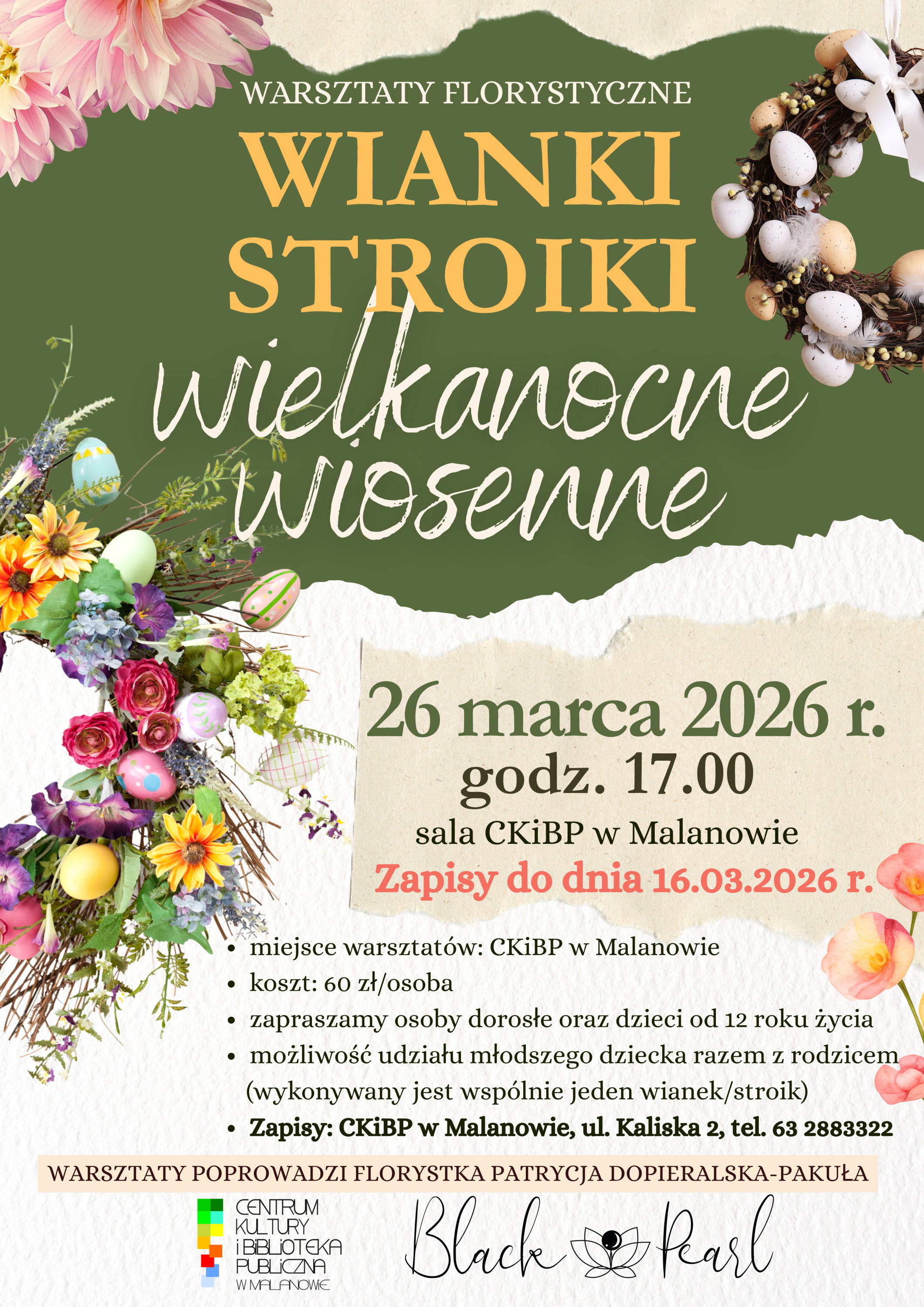 Zapraszamy serdecznie na wyjątkowe warsztaty florystyczne – „Wianki i stroiki wielkanocne, wiosenne”, które odbędą się 26 marca 2026 r. o godz. 17.00 w sali CKiBP w Malanowie.